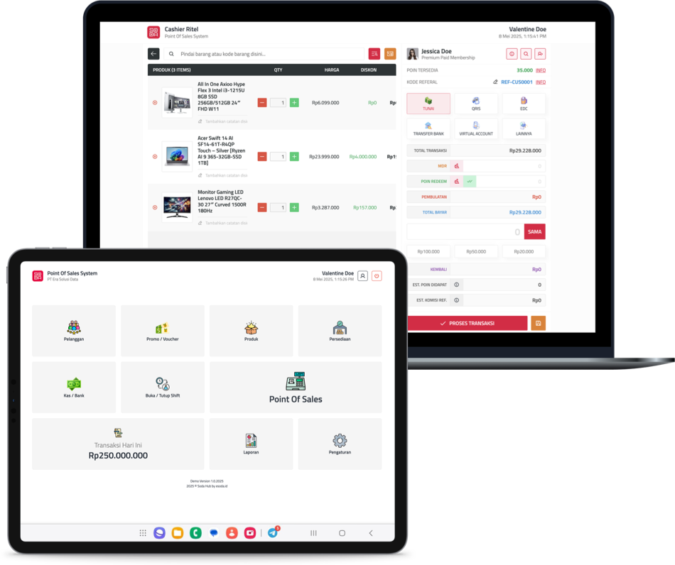 Solusi Sistem Kasir modern yang mendukung transaksi cepat, efisien, dan real-time. Mudah di akses kapanpun, di manapun dari berbagai device.